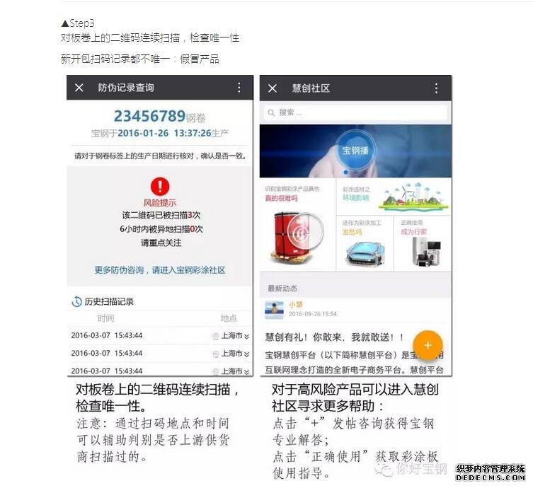 从2012年8月份开始,宝钢彩涂(tu)(tu)板(ban)首先在(zai)质保书(shu)上(shang)使用(yong)二维(wei)(wei)码,用(yong)户可通过(guo)(guo)手(shou)机等方式对二维(wei)(wei)码信息进(jin)行查询(xun)(xun),从而了解产品真伪;同时(shi),宝钢生产的(de)彩涂(tu)(tu)板(ban)背(bei)面都(dou)有特殊的(de)喷码打印,通过(guo)(guo)喷码标(biao)识也可辨(bian)(bian)别真伪;再(zai)者(zhe),用(yong)户还可上(shang)网查询(xun)(xun)、验证电子质保书(shu),与纸(zhi)质质保书(shu)进(jin)行校(xiao)对。通过(guo)(guo)以上(shang)三种主(zhu)要方式,基本可以辨(bian)(bian)别产品真伪。