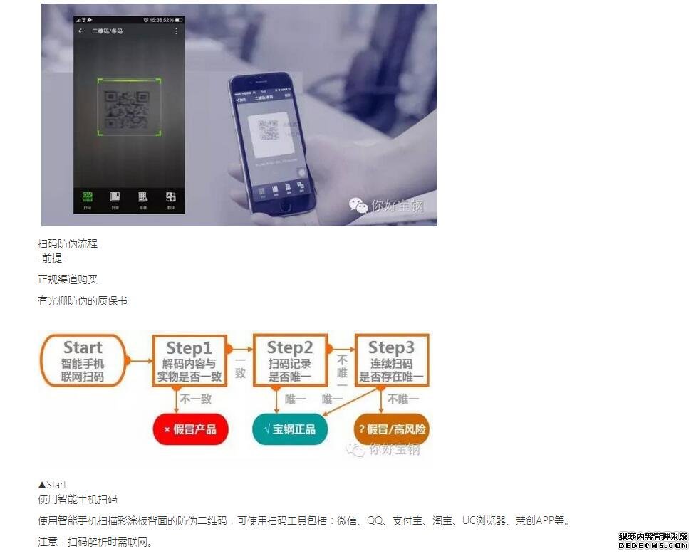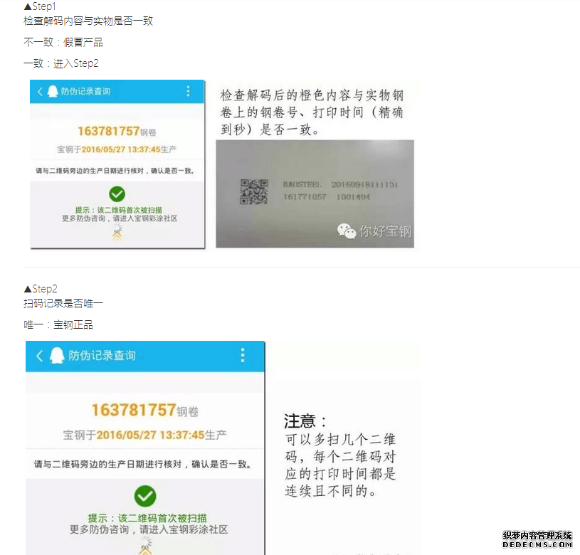 从2012年8月份开始,宝钢彩涂(tu)(tu)板(ban)首先在(zai)质保书(shu)上(shang)使用(yong)二维(wei)(wei)码,用(yong)户可通过(guo)(guo)手(shou)机等方式对二维(wei)(wei)码信息进(jin)行查询(xun)(xun),从而了解产品真伪;同时(shi),宝钢生产的(de)彩涂(tu)(tu)板(ban)背(bei)面都(dou)有特殊的(de)喷码打印,通过(guo)(guo)喷码标(biao)识也可辨(bian)(bian)别真伪;再(zai)者(zhe),用(yong)户还可上(shang)网查询(xun)(xun)、验证电子质保书(shu),与纸(zhi)质质保书(shu)进(jin)行校(xiao)对。通过(guo)(guo)以上(shang)三种主(zhu)要方式,基本可以辨(bian)(bian)别产品真伪。