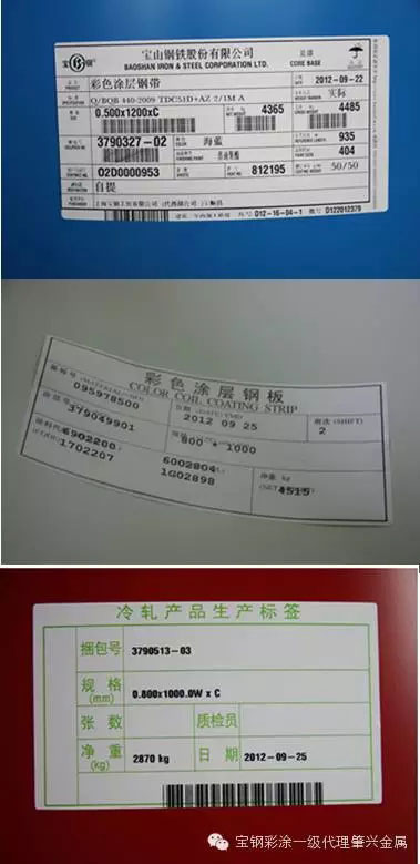 宝钢彩涂包装在内圈和外圈贴有相关标签:外标签(图1)、内标签(图2)、生产标签(图3)。生产标签在发货时被外标签覆盖。